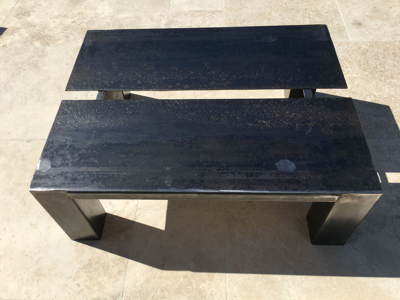 Les plateaux de la table basse sont réalisés avec des plaques servant à l’acheminement du blé récupérées dans une « meunerie », ce qui leur donne une patine et une usure si particulières
